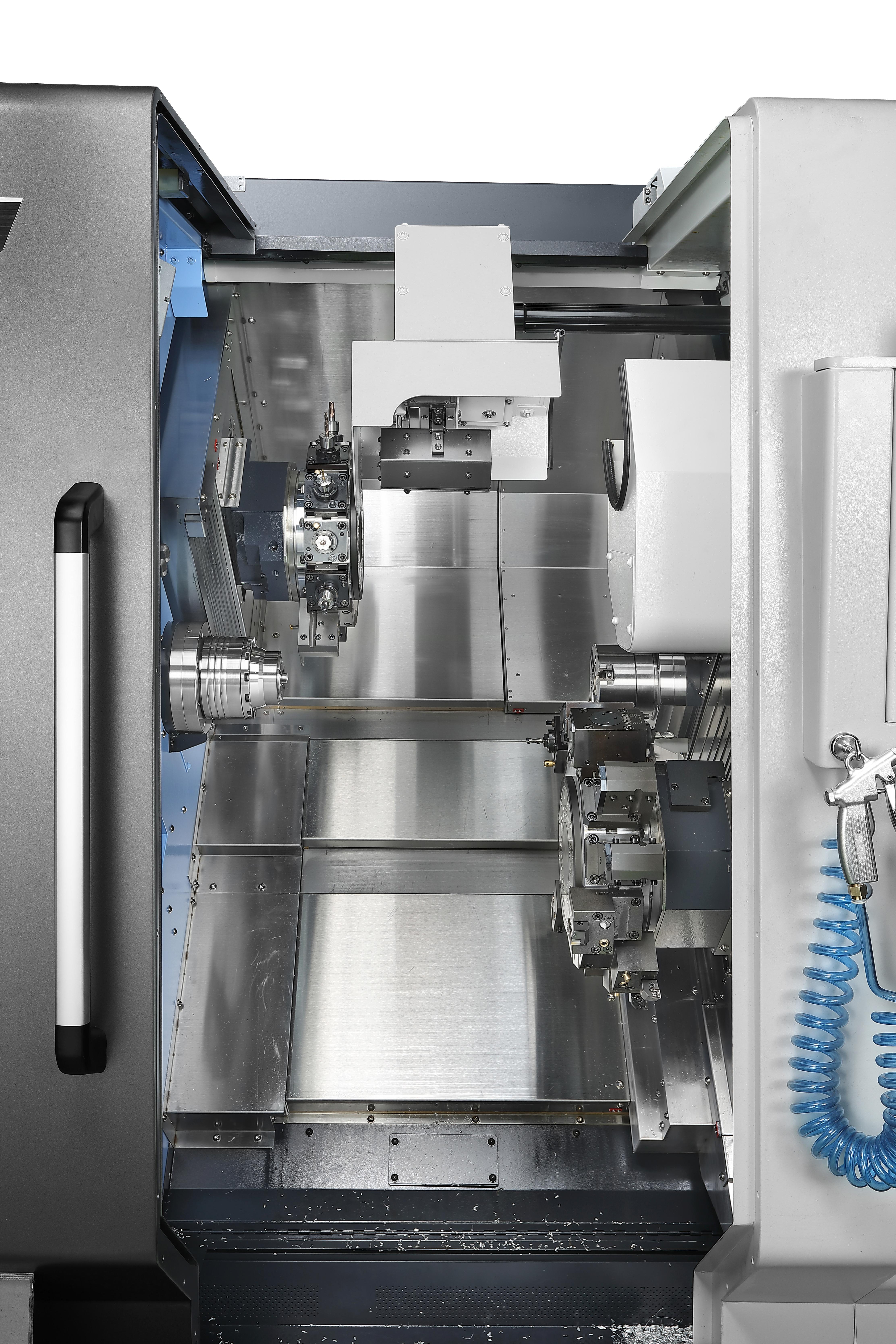- Fleksible bearbejdningsmuligheder: Udstyret med øvre/nedre revolver og Y-akse-funktionalitet til håndtering af komplekse opgaver med høj præcision.